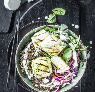 Bol de riz sauvage au citron vert, courgettes et palets de chèvre frais