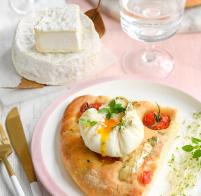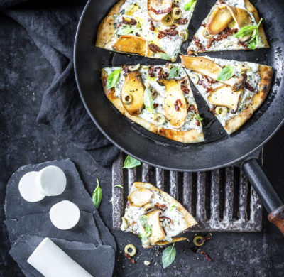 Pizza à la poêle aux pleurotes et à la bûchette de chèvre frais