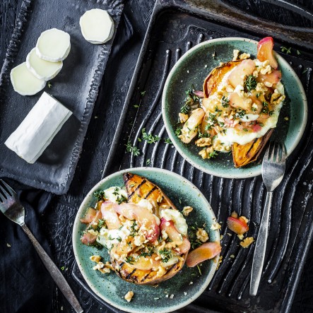 Sur une assiette, disposer la patate douce avec la crème au fromage de chèvre et au miel et la compote de rhubarbe. Laver le thym, le secouer pour le sécher et détacher les feuilles de la tige. Hacher grossièrement les noix. Ajouter le thym et les noix comme garniture sur la patate douce et servir.